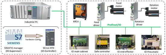 The proximity network used is Profinet/IO. Key elements of a Profinet/IO system are the input and output (IO)-Controller that controls the automation system, IO-Devices that are controlled by the IO-Controller and the IO-Supervisor software to define hardware configuration and parameter settings. Here, the IO-Supervisor is SIMANTIC manager and the IO-Controller is a PC-based PLC controller. Figure 10 shows the Profinet/IO fieldbus system. From the figure, the industrial PC is the control unit of the robotic cell, which collects data and sends control commands to the OMEs. The KRC4 controller reads commands from the main controller (Industrial PC) and sends requested information to the control unit. Feed and rotation motors in the end-effector receive signals from the respective drivers. Other devices are the IO main cabinet, the safe controller, the IO end-effector and the IO pneumatic. These are used to send and receive data from sensors in the robotic cell and end-effector.