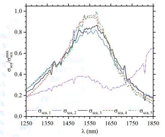 Comparative plot of the scattering cross-section  (associated with Case i) for the optimized designs. The results are normalized in relation to the maximum  value, which was Case 5 in this work.