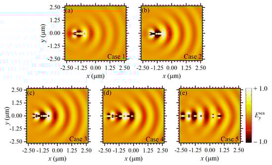 (a–e) The electromagnetic scattered fields (near-fields) for Cases 1 to 5, respectively.