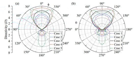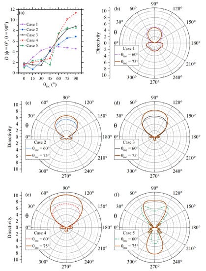 (a) Comparative analysis of directivity towards -axis [], as a function of , for all five cases. Numerical results of the corresponding far-field patterns for  and  are comparatively plotted in (b–f) for all five cases, respectively.