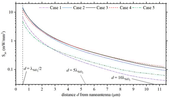 The calculations in Figure 4 were made for . Nevertheless, the incident angle also affects the directivity along the x-axis. In fact, the best results are expected for , as noticed from the numerical results for Cases 3 and 4 in Figure 5a, where the maximum directivity is achieved for each case. However, conventional PICs are fed by the end of the tilt optical fiber. Therefore, to be consistent with the current developments in PICs, the far-field radiation patterns for Cases 1 to 5 are compared in Figure 5b–f, respectively, considering  and . It should be remarked that results for  and  only have a negligible difference, see Figure 5a. To emphasize the feasibility of the optimized design in this work, the time-averaged Poynting vector, namely,  was calculated along the x-axis, as shown in Figure 6, for all five cases. The feed laser light is considered with an incident angle . Since we are interested in the energy radiated into the far-field region, calculations in this last figure were made at a distance of  from the last director (defined as ) of each design. The numerical data for the propagation losses are in qualitative agreement with what is expected from the Friss equation. Moreover, the results for  indicate the possibility of developing optical wireless nanolinks separated by distances d that are several times larger than , which are in agreement with the far-fields in Figure 4 (specifically for ).