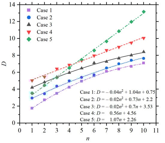 Directivity D as a function of the number of directors n for Cases 1 to 5.
