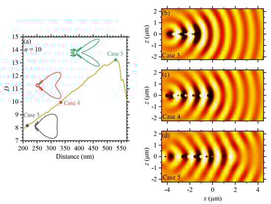 (a) Directivity as a function of the inter-particle distances for Cases 3 to 5 corresponding to . (b–d) Show the corresponding scattered fields (around the structure) for each case.