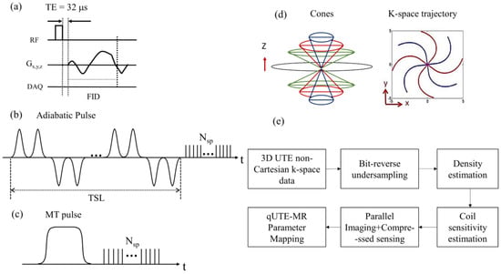 (a) UTE-Cones sequence with a short rectangular pulse, (b) adiabatic T1ρ signal preparation that uses a train of adiabatic full-passage pulses to generate T1ρ contrast followed by 3D UTE-Cones data acquisition, (c) MT preparation, (d) 3D Cones k-space trajectory, and (e) general flow involved in the accelerated quantitative UTE-Cones imaging.