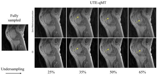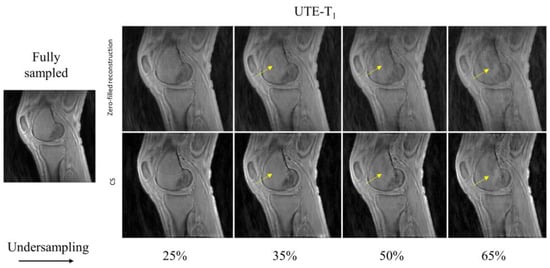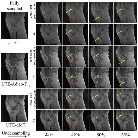 Figure 9 portrays a special case with a 27-year-old female patient who has tibial tunnel from a previous ACL reconstruction, which is clearly depicted in the CS-reconstructed images (red arrows). Susceptibility artifacts are shown in the tibial tunnel (red arrows) on the distal portion, as shown in the sagittal UTE MRI data of the knee. Similar to the healthy control dataset, the presence of artifacts and blurring of information is visible in various sections of images from a zero-filled reconstruction. CS reconstruction, on the other hand, provides a consistent and reliable image quality up until 65% undersampling (yellow arrows).