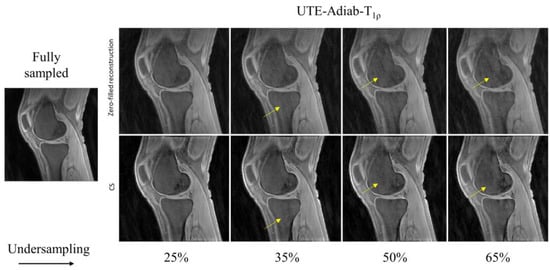 Comparison of UTE-Adiab-T1ρ-reconstructed images at different undersampling rates between zero-filled reconstruction (top row) and CS-based reconstruction (bottom row). Image reconstructed using entire k-space data is shown as the reference. Reconstructed images using incomplete (i.e., undersampled) k-space via zero-filling carries streaking artifacts that are resolved using CS-based reconstruction, as marked by the yellow arrows.
