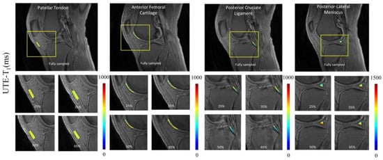 Quantitative mapping of UTE-T1 parameter at different undersampling levels in four representative ROIs. A representative region is chosen from each group, namely tendon (patellar tendon), cartilage (anterior femoral cartilage), ligament (posterior cruciate ligament), and meniscus (posterior lateral meniscus). The T1 quantification values ranged between 500 to 1000 ms. The parameter maps show high correlation between different undersampled maps except posterior lateral meniscus, with values between 900 and 800, a margin of 100 ms.