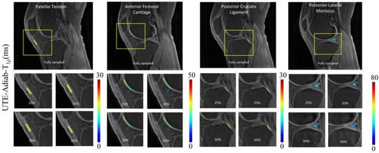 Quantitative mapping of UTE-Adiab-T1ρ parameter at different undersampling levels in four representative ROIs. The estimated T1ρ parameter ranged between 15 and 40 ms in the aforementioned ROIs.