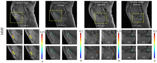 Quantitative mapping of UTE-qMT parameter (i.e., MMF) at different undersampling levels in four representative ROIs. The estimated MMF ranged between 0.12 and 0.19. For the PCL region, due to partial volume effect, quantitative maps showed visible changes between images with different undersampling rates.