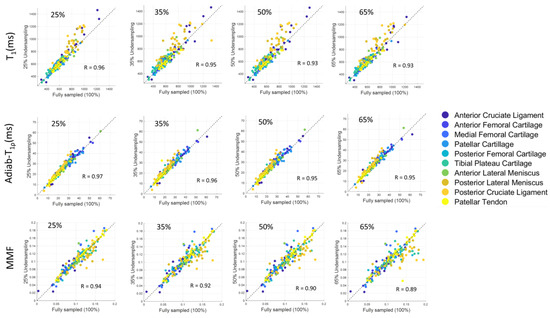 Scatter plot for various quantification parameters (i.e., T1, T1ρ, and MMF) at different undersampling levels in ROIs from human knee joint. Correlation coefficient (R) recorded over 0.85 for all parameters in all four undersampling rates. While very few points can be recognized as outliers, parameters estimated in most of the ROIs showed high linearity between undersampled CS reconstruction and fully sampled reconstruction.