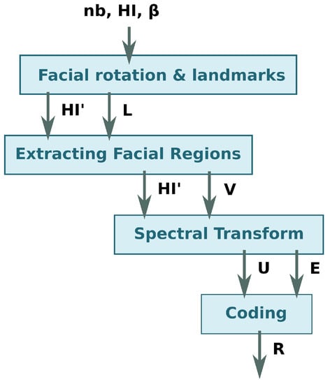 The process performed by the HyperFEA algorithm to hyperspectral images consists of four main stages, which are: (1) facial landmarks stage, which extracts the points where a face is located and the face is optionally rotated horizontally to align it; (2) extracting facial regions of interests (ROI) where the unused spatial information is removed; (3) a spectral transform; (4) a coding stage. The HyperFEA spectral transform selects the most different pixel and the average pixel of each facial ROI. Figure 1 graphically shows these four stages, as well as the data shared between them.