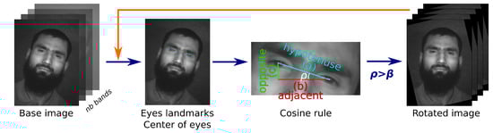 Face alignment is an early stage of the modern face recognition pipeline that increases the recognition accuracy, which is optional in our proposal. Figure 2 shows the steps performed in the face alignment process. The first step is to detect the location of the eyes to extract the center of them and imaginatively draw a line between the two centres. Thus, the angle formed by the horizontal line with the previously one () gives the degree of inclination of the face. From this angle we can determine the rotation degrees by applying inverse trigonometry functions (arc cosine function), the result in degrees determines the angle to rotate the image, whenever its value is greater than , i.e., the threshold degree parameter. Once the image is rotated, the algorithm checks that the face is horizontally aligned by a new iteration, it means the rotated image is the new input (orange arrow of Figure 2). In general, the constraint is fulfilled in the first iteration, which is an important issue when working with hyperspectral images, due to the computational cost required; the operations of the rotation stage are applied to all bands, i.e., the face alignment stage is repeated at least nb times. Thus, the hyperspectral face is horizontally aligned, (line 1 of Algorithm 1).