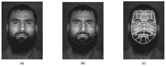 Extracting facial regions of interest from facial landmarks. (a) Base image. (b) Facial Landmarks. (c) Facial regions of interest.