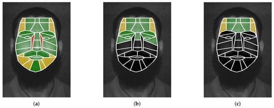 It is worth mentioning that clothing accessories and/or facial masks hide part of the face, so this work only takes the upper facial ROI for the experiments; from ten to nineteen regions. Figure 4b,c highlight the facial ROI considered, using the same colors that were used to mark the quality of the spatial information, whilst regions that are omitted are darkened.