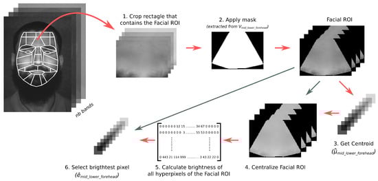 Figure 5 graphically shows the flow to extract the spatial information of the mid_lower_forehead facial ROI from a hyperspectral face. The algorithm extracts a rectangle that contains the hyperspectral pixels of the facial ROI to then apply a mask to crop the region, considering the pixels that are inside the region. Thus, the algorithm obtains the number of valid pixels and extracts the average value of each spectral band to build the centroid () and extracts the brightest hyperspectral pixel (). It is worth mentioning that the spectral information extracted of each facial ROI can be performed in parallel.