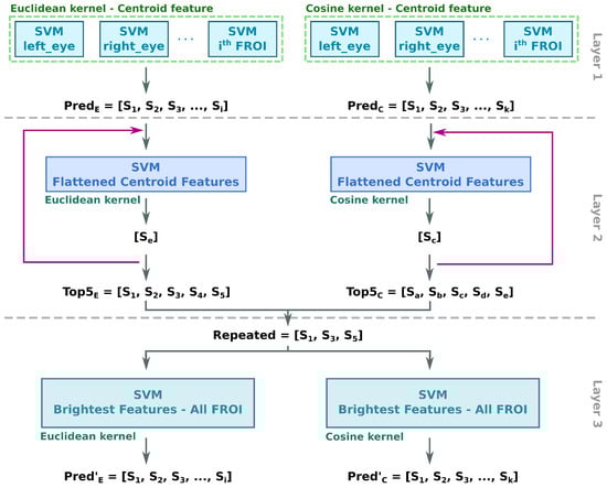 Once the first list of candidates is extracted by layer 1, it is necessary to measure the distance of the complete spatial signature between all the candidates and the unknown individual. For each ROI, the centroid and brightest pixels are selected and flattened in a single spatial features vector. Then, two SVM (one for each aforementioned kernel) are trained during run-time with the flattened spatial information vector in parallel. Afterwards, classification of the individual takes place. This process depends on the output of the previous layer, so the SVMs are trained every time an outsider is classified (adaptive feature). As a result, the two SVMs predict two possible candidate sets; the ones whose Euclidean distance and cosine similarity are the shortest, respectively, ( and ). Whenever the size of the and lists are not equal, they must be extended. Finally, the second layer of the AP-SVM extracts the top five candidates of both SVMs ( and lists).
