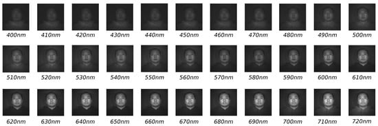 In this section, the hyperspectral data used for evaluating the recognition accuracy of the proposed model are introduced. The hyperspectral dataset used in experiments has been provided by The University of Western Australia through a database that consists of 164 facial hyperspectral images of 79 different subjects (UWA-HSFD), where 75 individuals are males and 4 females; of those 75 males, 13 wear glasses, while in the case of females, only one wears glasses. The face database was sensed by CRI’s Varispec LCTF, equipped with a photon focus camera helping in adjusting exposure time, luminance adaption and CCD sensitivity. Image cubes were captured over 33 bands from 0.4 μm to 0.72 μm with a difference of 0.1 μm; each band is stored in separate files. Figure 7 shows an example of a subject’s face cube with the 33 bands []. The hyperspectral images have been organized in four sessions, i.e., the repeated faces were taken on different days. Unfortunately, this dataset presents an important challenge; some subjects did not keep their head still during the process of capturing the image cube, so there are variations in the dataset.