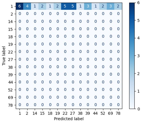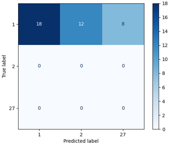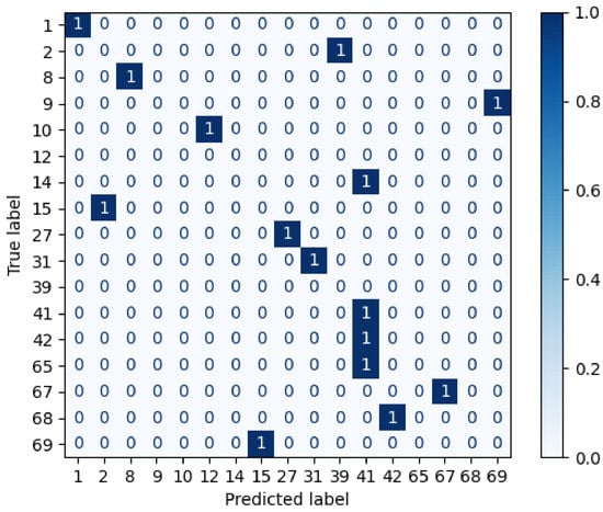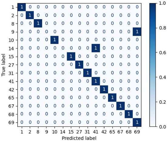 Afterwards, the repeated candidates are the input of the third layer, which calculates the brightest cosine and Euclidean distance. Thus, the subjects (1, 2, 27) are considered to identify the individual. Figure 10 shows the confusion matrix after measuring the cosine and Euclidean distances of the brightest pixels. Therefore, the AP-SVM determines that the unknown individual is the subject 1, because it contains more similarities than the others, i.e., it has more coincidences in the brightest distance feature.