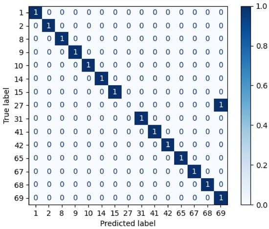 The first scenario does not introduce objects that occlude any facial ROI, so there are 36 visible regions to extract the spatial information (see Figure 4a). In total, 72 features are obtained corresponding to the centroids and the brightest pixels of each of the visible areas. This fact reduces the spectral information by roughly 99.9933% that is used to classify the unknown individuals. Figure 11 shows the confusion matrix in this scenario, in which the recognition accuracy achieved is 93%, i.e., 14 out of 15 individuals are recognised by the AP-SVM.