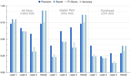 These evaluation criteria on face classification have been applied in the three aforementioned scenarios: all face (100% ROI), upper face (50% ROI) and forehead (25% ROI). Figure 14 graphically shows the results of the evaluation metrics used in the different layers of the AP-SVM tree and on the overall AP-SVM. It is worth mentioning that Recall and Accuracy bear the same values, meaning the model is somehow balanced, i.e., the AP-SVM is able to correctly classify positive unknown individuals as well as correctly classify negative unknown individuals.