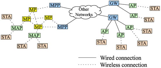 However, the throughput of LPWA is lower than the other technologies, so WLANs can be a good choice when high throughput is required. Nowadays, WLANs have enough specifications to adapt not only for small, high-speed networks but also for IoT networks. For example, IEEE802.11ax can save energy consumption using target wake time technology []. Additionally, the communication distance of WLANs in IEEE802.11ax becomes longer compared with conventional standards [,]. Moreover, the communication distance of WLANs is now also suitable for IoT. For example, IEEE802.11ah, which is a long-range WLAN, has extended communication distance to 1 km [,]. In particular, the wireless mesh networks (WMNs), which are WLANs with mesh topology specified previously by the IEEE802.11s standard and currently included in IEEE802.11, can be a good choice for IoT because they offer high scalability, high robustness, high maintainability, and high-speed connection. WMNs can be used as last mile networks and for wireless sensor network (WSN) applications in medical, transport and surveillance systems in urban areas, metropolitan areas, neighbor communities and municipal area networks, among others.