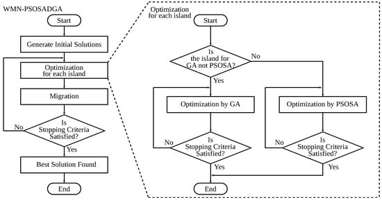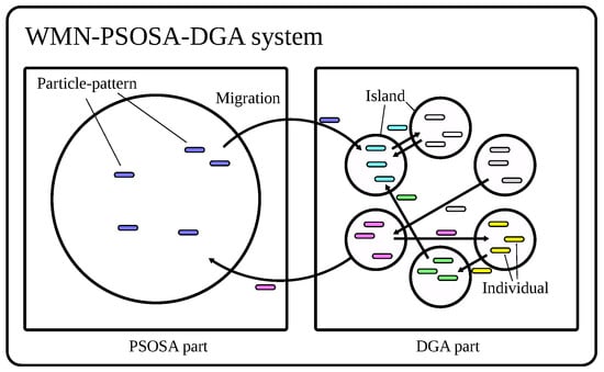 The model of WMN-PSOSA-DGA migration is shown in Figure 4. The processes of the PSOSA part and the DGA part are independent from each other. The implemented WMN-PSOSA-DGA hybrid intelligent system considers islands to enhance the diversity of solutions. The migration operation migrates a solution (particle pattern or individual) to other islands. The operations of each island are different. Therefore, we show the individuals with different colors. The migration operation is performed periodically during the simulation process. There are many migration methods []. We show the flowchart of WMN-PSOSA-DGA in Figure 5.