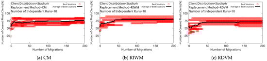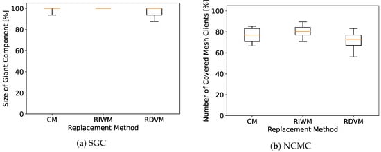We see that every replacement method converges to 100% for SGC, as shown in Figure 7. However, WMN-PSOSA-DGA does not reach 100% for NCMC in this case, as shown in Figure 8. We show boxplots of the results for each replacement method in Figure 9. We can see that RIWM has the highest performance compared to CM and RDVM.