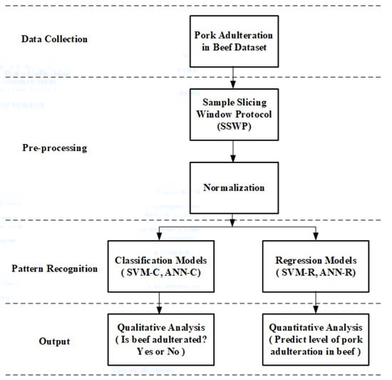 To perform the qualitative analysis by detecting whether beef is adulterated with pork, two classification models, SVM-C and ANN-C, were employed in our study. The input to the classification models is the normalized early portion of data generated from the SSWP.