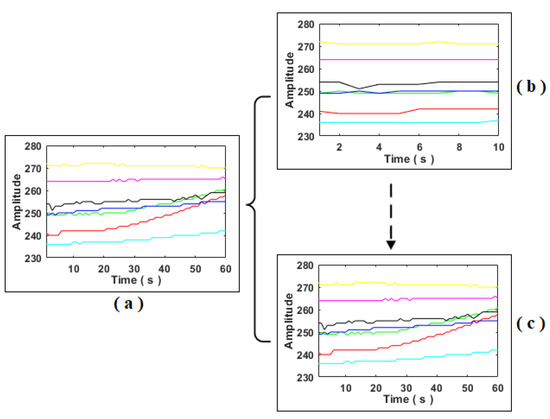 To the pork adulteration in beef dataset discussed in Section 2.1, SSWP detailed in Section 2.2 is implemented. The whole dataset contains 420 measurements, with each measurement having 60 records. After multiple experimental simulations on step size, is assigned with a value of 10, generating six windows. Using Equation (1), the early part of the signals for the concerned window is generated, and the early part of the signals for all six windows required in this study is represented in Equation (7).