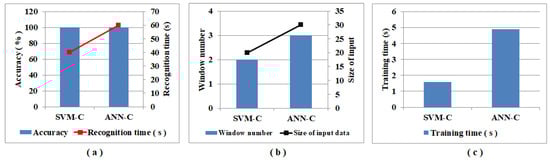 Graphical representation of a comparison of performance metrics (a) accuracy, recognition time, (b) window number, size of input data, and (c) training time of classification models SVM-C and ANN-C.