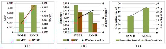 Graphical representation of a comparison of performance metrics (a) MSE, RMSE (b) R, R2, window number (c) recognition time, size of input data of regression models SVM-R, and ANN-R.