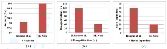 Graphical representation of a comparison of performance metrics: (a) accuracy; (b) recognition time; (c) size of the input data of R. Sarno et al. [] and the SE-Nose methodology.