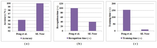 Graphical representation of a comparison of performance metrics: (a) accuracy; (b) recognition time; and (c) the training time of Peng et al. [] and the SE-Nose methodology.