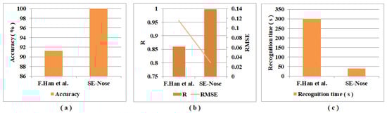 Graphical representation of the comparison of performance metrics: (a) accuracy; (b) R, RMSE; and (c) recognition time of F. Han et al. [] and the SE-Nose methodology.