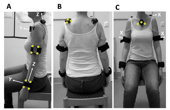 Visual grading based on the Active Movement Scale [] and modified Mallet score [] was developed to facilitate long-term follow-ups for range of motion and muscle function in BPBI patients and is used extensively throughout the world []. The scales are efficient and easy to implement in clinic but have been criticized as too subjective and missing crucial functional deficiencies [,,,,]. Further, these scales do not describe how the glenohumeral joint and scapulothoracic articulation contribute to global shoulder (i.e., thoracohumeral) shoulder motion. The coordinated movement in the glenohumeral and scapulothoracic joints, referred to as the scapulohumeral rhythm, is indeed important for the optimal function of the shoulder [,,]. Goniometry and Medical Research Council 0–5 grading [] are alternative methods to assess changes in range of motion and muscle strength but are difficult to implement in infants and younger children. Another approach is to use a three-dimensional kinematic analysis of the shoulder complex [,,,]. Such methods have been used to identify deficient external rotation in the glenohumeral joint and the global movement of the shoulder in children with BPBI when performing tasks of the modified Mallet scale [,]. Further, a recent study evaluated a clinical tool that incorporates real-time visual feedback with three-dimensional optical motion capture to measure and analyze shoulder function in BPBI patients []. Optical motion capture, a gold standard technique, requires special movement laboratories [], which makes it unsuitable for regular assessments of shoulder function. Another study used inertial movement unit (IMU) sensors on the thorax and arms with a machine learning algorithm to classify BPBI patients and controls based on arm and trunk movement []. As recently reviewed, wearable inertial movement units (IMUs) based on accelerometers, gyroscopes, and/or magnetometers have the potential to be used in clinical assessments, but there is a need for reliable and standardized measurement and analysis methods to achieve sufficient accuracy and give robust clinical applications []. This is especially important when analyzing shoulder complexes since scapular movements are small and associated with disturbances from skin and tissue movement.