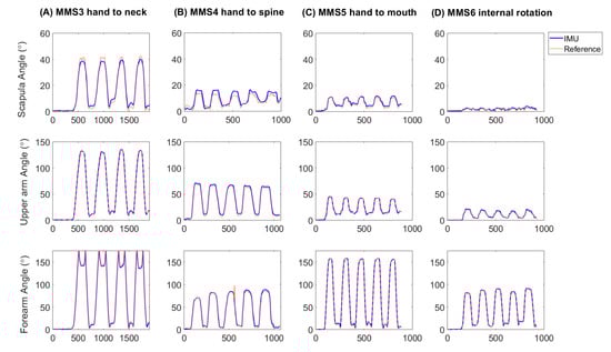 Examples of data from one test person during four of the tasks included in the modified Mallet score MMS3 hand to neck (A), MMS4 hand to spine (B), MMS5 hand to mouth (C), MMS6 internal rotation (D) as simultaneously measured with the reference system (red line) and the IMU system (thick blue line). The segment helical angle was calculated for scapula (upper row), upper arm (middle row) and forearm (bottom row).