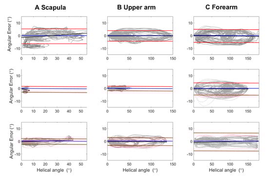 Bland–Altmann plots illustrate system agreements of the IMU system with the reference system. The helical angle was calculated for each segment, scapula (A), upper arm (B) and forearm (C). Angular errors were calculated for tasks involving large shoulder movements in one plane (upper row, shoulder flexion−extension, MMS1 global abduction and MMS2 global external rotation), for elbow mobility tasks (middle row, elbow flexion−extension and forearm pronation–supination); tasks involving movement in both elbow and shoulder (bottom row, MMS3 hand to neck, Mallet MMS4 hand to spine, MMS5 hand to mouth and MMS6 internal rotation). The mean error is illustrated with a blue line, and the error 95% confidence intervals are marked with red lines.