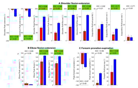 Outcome measures from the assessment of (A) shoulder and (B,C) elbow mobility. Group mean and standard error of mean are illustrated (BPBI: red left bar, control: blue right bar). ICC from test–retest reliability and p-values from t-tests are shown in the upper right corner of each subplot and are highlighted green for outcome scores with both good test–retest reliability (ICC > 0.75) and a significant group difference (p < 0.05).