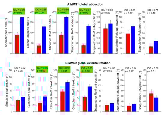 Outcome measures from the assessment of two tasks from the modified Mallet scale (MMS); (A) global abduction and (B) global external rotation. Group mean and standard error of mean are illustrated (BPBI: red left bar, control: blue right bar). ICC from test–retest reliability and p-values from t-tests are shown in the upper right corner of each subplot and are highlighted green for outcome scores with both good test–retest reliability (ICC > 0.75) and a significant group difference (p < 0.05).