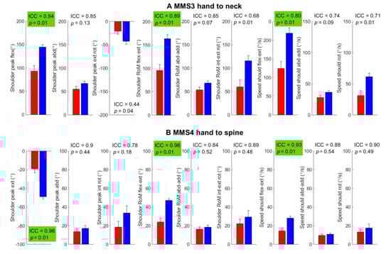 Outcome measures from the assessment of two tasks from the modified Mallet scale (MMS); (A) hand to neck and (B) hand to spine. Group mean and standard error of mean are illustrated (BPBI: red left bar, control: blue right bar). ICC from test–retest reliability and p-values from t-tests are shown in the upper right corner of each subplot and are highlighted green for outcome scores with both good test–retest reliability (ICC > 0.75) and a significant group difference (p < 0.05).