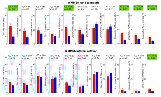 Outcome measures from the assessment of two tasks from the modified Mallet scale (MMS); (A) hand to mouth and (B) internal rotation. Group mean and standard error of mean are illustrated (BPBI: red left bar, control: blue right bar). ICC from test–retest reliability and p-values from t-tests are shown in the upper right corner of each subplot and are highlighted green for outcome scores with both good test–retest reliability (ICC > 0.75) and a significant group difference (p < 0.05).