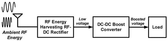 Block diagram of RF energy harvesting system consisting of RF energy harvesting RF-DC rectifier and DC-DC boost converter.
