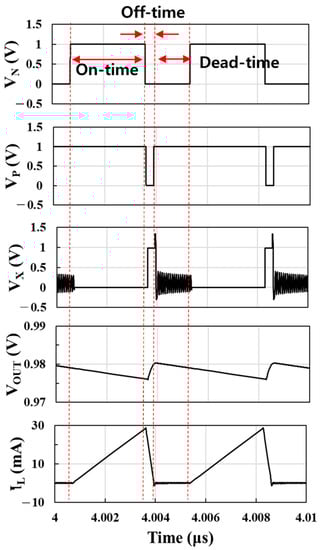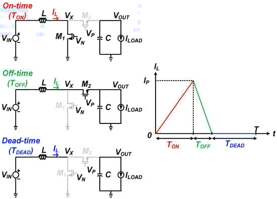 For low input voltage operation, it is more efficient to operate in discontinuous conduction mode (DCM) []. Figure 3 shows the DCM operation and inductor current (IL) waveform of the DC-DC boost converter. The DCM operation of the DC-DC boost converter has three stages: on time (TON), off time (TOFF), and dead time (TDEAD). During the on-time phase, the NMOS switch M1 turns on and the PMOS switch M2 turns off. In this phase, the current through the inductor IL increases at a constant slope up to the peak inductor current (IP), so magnetic energy is stored in the inductor. As the output capacitor C is discharged by the constant load current source, the output voltage decreases with a constant slope. During the off-time phase, switch M1 turns off and switch M2 turns on. In this phase, the output capacitor is not only discharged by the constant load current but also charged by the current flowing through the inductor. Thus, the energy in the inductor is transferred to the output load current (ILOAD) and output capacitor, and the inductor current decreases with a constant slope from IP to zero. During the dead-time phase, the PMOS switch M2 opens and the NMOS switch M1 remains open. In this phase, both the voltage across the inductor and the inductor current flowing through it are zero because both switches are open. The output of the converter is in the same state as the on-time phase, and the output voltage decreases with a constant slope as the output capacitor is discharged by the constant load current source. In DCM operation, the switching frequency is expressed in terms of inductance L and peak inductor current IP for given VIN, VOUT, and ILOAD conditions as