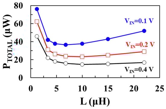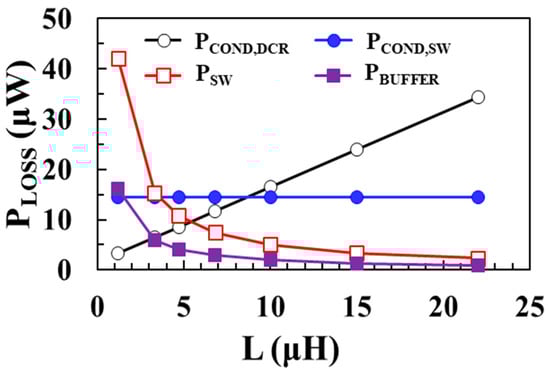 Figure 4 shows the modeling results of each loss component of the boost converter according to the inductance L using (3)–(6) when VIN = 0.1 V, VOUT = 1 V, ILOAD = 1 mA, WM1 = WM2 = 20 mm, and IP = 30 mA. The inductor is designed as an off-chip component and the DCR of the inductor is modeled as a resistance value that increases with L. As shown in Figure 4, as the inductance increases, conduction loss of the inductor increases and switching loss and buffer loss decrease.