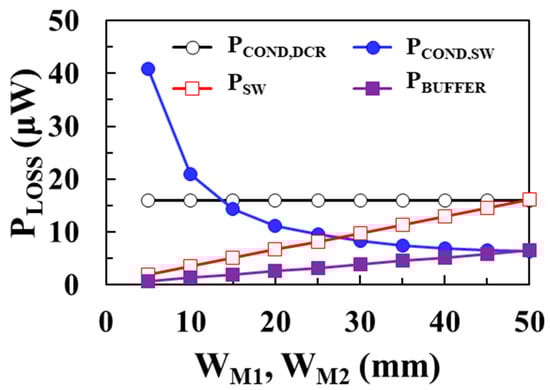 Figure 5 shows the modeling results of each loss component of the boost converter according to the widths of M1 and M2 switches using (3)–(6) when VIN = 0.1 V, VOUT = 1 V, ILOAD = 1 mA, L = 10 μH, and IP = 30 mA. As shown in Figure 5, as the width of the MOSFET switches increases, conduction loss of the switches decreases and the switching loss and buffer loss increase.