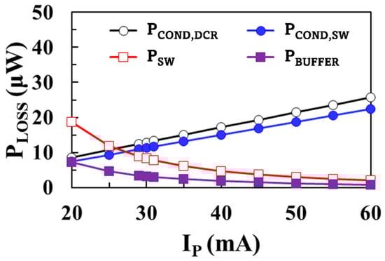Figure 6 shows the modeling results of each loss component of the boost converter according to the peak inductor current IP using (3)–(6) when VIN = 0.1 V, VOUT = 1 V, ILOAD = 1 mA, WM1 = WM2 = 20 mm, and L = 10 μH. As the peak inductor current increases, conduction loss of the inductor and switches increase and switching loss and buffer loss decrease.