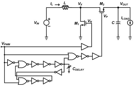 Figure 7 shows the schematic of the DC-DC boost converter with the control circuits for generating the pulses to drive and control the switches. The low input voltage DC-DC boost converter operates in discontinuous conduction mode (DCM) to obtain higher efficiency at the low input voltage operation of 0.1 V. A pulse width modulation (PWM) scheme-based control system is applied to keep the output voltage constant in the DC-DC boost converter. The PWM scheme-based control method adjusts the output voltage of the converter under different load current conditions by adjusting the duty cycle of the drive signal with a fixed frequency []. The duty cycle of the driving signal to control the NMOS and PMOS switches of a DC-DC converter is proportional to the control voltage, which is the difference between the output voltage of the converter and the reference voltage. The PWM input (VPWM) is used to drive the switch transistor M1 through the buffer. The time delay controlled by the digital gates and CDELAY compensates for the time delay between the switch control signals VN and VP so that transistor M2 turns on quickly enough after transistor M1 turns off. The output of the OR gate drives the gate of the switch transistor M2 through a buffer. Current sensing for switch transistor M2 is performed by a comparator and the comparator’s output signal is used to sense when the current through switch transistor M2 goes to zero.