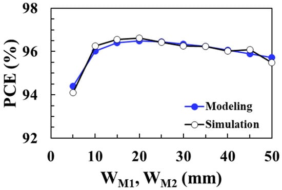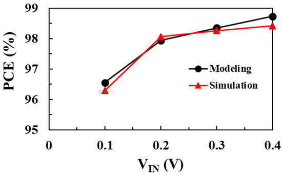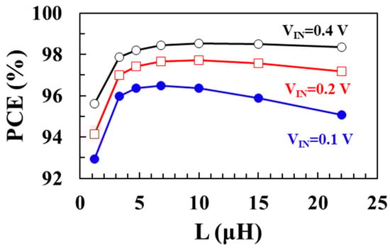 Figure 19 shows the PCE of the converter according to the input voltage and compares the circuit simulation results with the proposed modeling results when VOUT = 1 V, ILOAD = 1 mA, and WM1 = WM2 = 20 mm. Based on the proposed optimal design methodology to achieve the maximum PCE, the optimal values of inductance and peak inductor current are designed differently according to the input voltage. As the input voltage increases, the optimum inductance and peak inductor current to achieve the minimum total loss increase. At an input voltage of 0.1 V, a maximum PCE of 96.5% is achieved when L is 6.8 μH and IP is 29 mA. On the other hand, at an input voltage of 0.4 V, a maximum PCE of 98.4% is achieved when L is 10 μH and IP is 33 mA. The PCE modeling results achieved from the proposed efficiency optimization design method based on loss analysis and modeling are in good agreement with circuit simulation results over a wide input voltage range. By deriving the optimal design parameters including inductance and peak inductor current for different input voltages, the maximum PCE is achieved over a wide input voltage range.