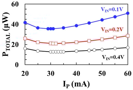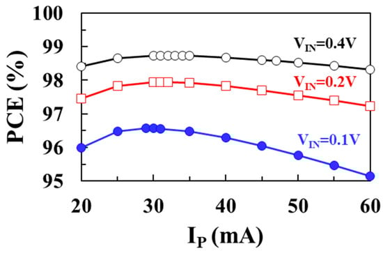 Figure 10 shows the modeled total loss (PTOTAL) as a function of peak inductor current IP using (7) for input voltages of 0.1 V, 0.2 V, and 0.4 V, respectively, when VOUT = 1 V, ILOAD = 1 mA, L = 10 μH, WM1 = WM2 = 20 mm. Figure 11 shows the PCE according to the peak inductor current (IP) for input voltages of 0.1 V, 0.2 V, and 0.4 V, respectively. As the input voltage increases, the optimum peak inductor current to achieve the minimum total loss increases. At an input voltage of 0.1 V, a maximum efficiency of 96.6% is achieved when IP is 29 mA. At an input voltage of 0.2 V, a maximum efficiency of 97.7% is achieved when IP is 31 mA, and at an input voltage of 0.4 V, a maximum efficiency of 98.7% is achieved when IP is 33 mA.