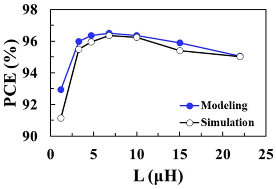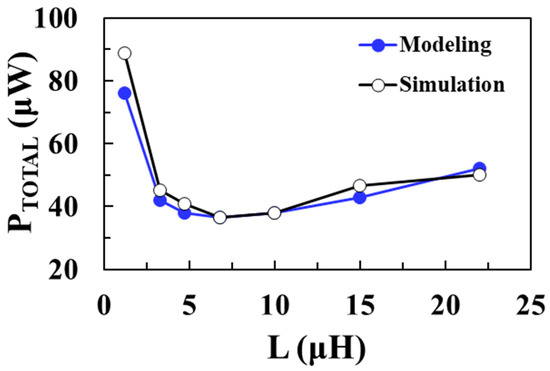Figure 13 shows the total loss of the DC-DC boost converter according to the inductance L for an input voltage of 0.1 V and compares the circuit simulation results with the proposed modeling results when VOUT = 1 V, ILOAD = 1 mA, WM1 = WM2 = 20 mm, and IP = 30 mA. As the inductance decreases, the switching frequency increases and the switching losses of NMOS and PMOS increase. On the other hand, as the inductance increases, the ESR of the inductor increases and conduction loss of the inductor increases. Therefore, there is an optimal inductance value that minimizes the total loss. It shows that the modeled total loss of the boost converter agrees well with the circuit simulation results, with a minimum loss of 36.4 μW achieved for an L of 6.8 μH. Figure 14 shows the PCE of the converter according to L for an input voltage of 0.1 V and compares the circuit simulation results with the proposed modeling results. A maximum efficiency of 96.5% is achieved at an optimum L of 6.8 μH and the proposed model accurately predicts the optimal L value to obtain the maximum PCE.